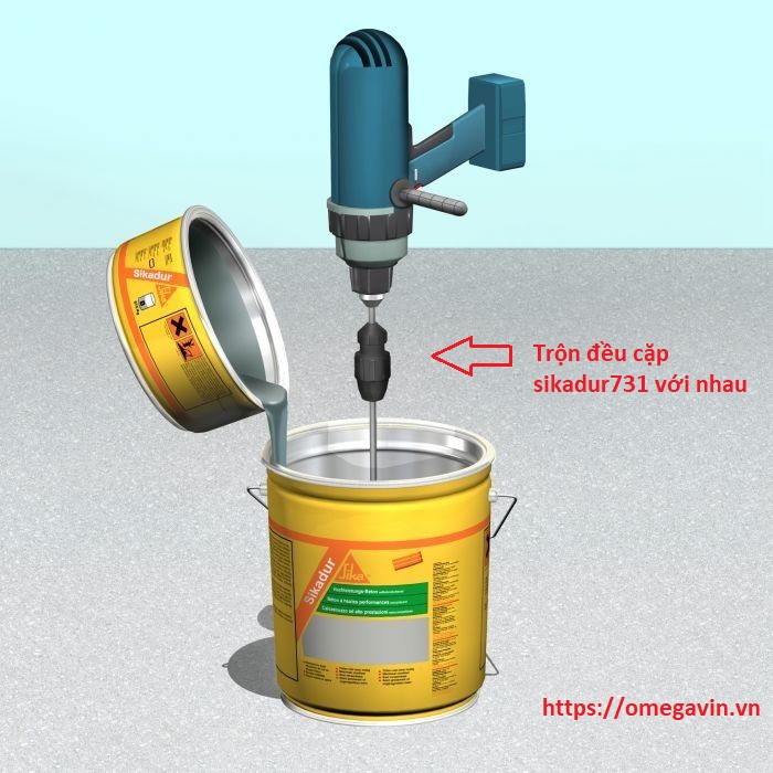 Trộn: Trộn hai thành phần lại với nhau trong vòng ít nhất 3 phút bằng cần trộn tay có tốc độ thấp (không quá 500 vòng/phút) cho đến khi hỗn hợp trở nên mịn, sệt có màu xám đều.