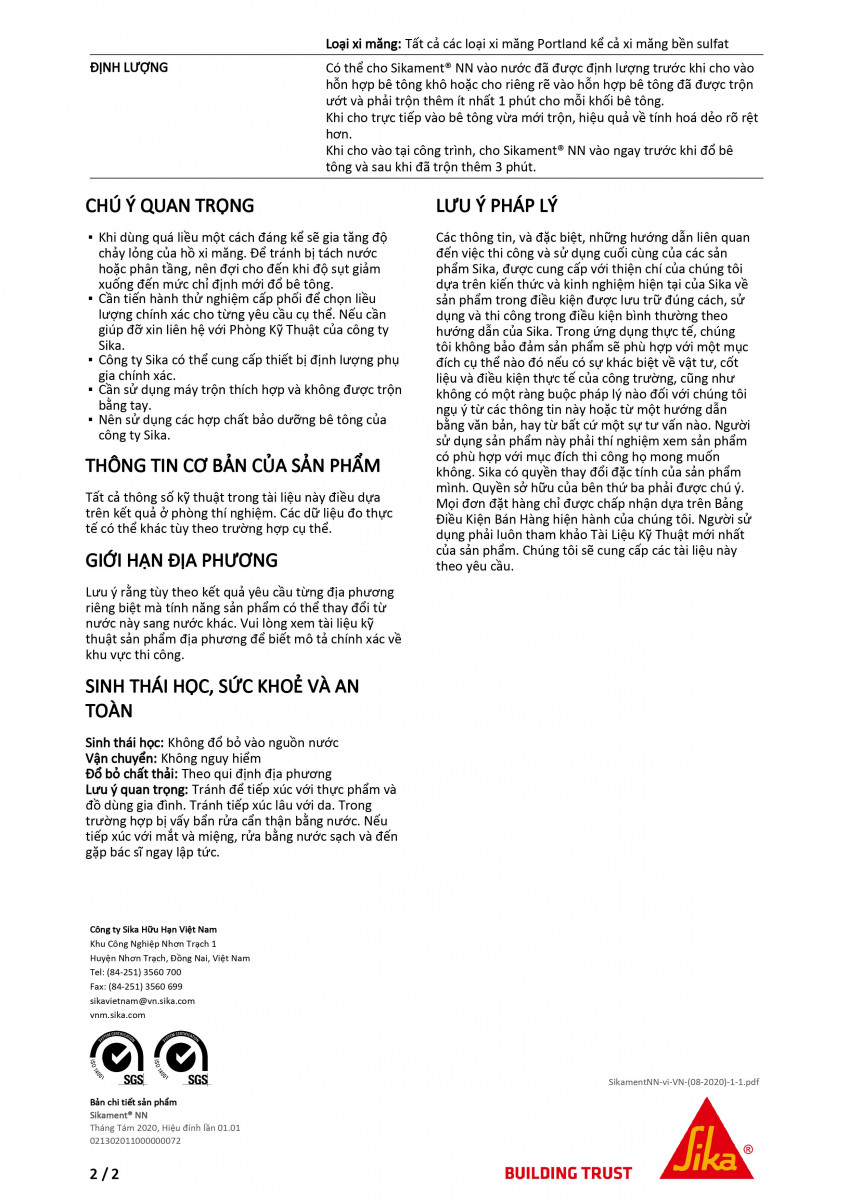 Phụ gia bê tông Sikament NN là một dung dịch có hai tính năng vừa là chất siêu hóa dẻo được dùng để sản xuất bê tông chảy lỏng và là tác nhân giảm nước đáng kể để đạt cường độ ban đầu và cường độ cuối cùng cao.